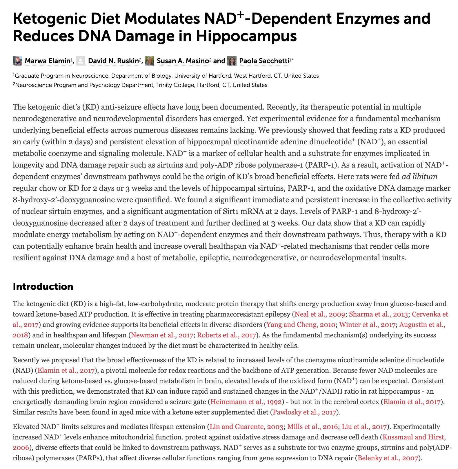 "Our data show that a KD can rapidly modulate energy metabolism by acting on NAD+-dependent enzymes and their downstream pathways. Thus, therapy with a KD can potentially enhance brain health and increase overall healthspan via NAD+-related mechanisms that render cells more resilient against DNA damage and a host of metabolic, epileptic, neurodegenerative, or neurodevelopmental insults."