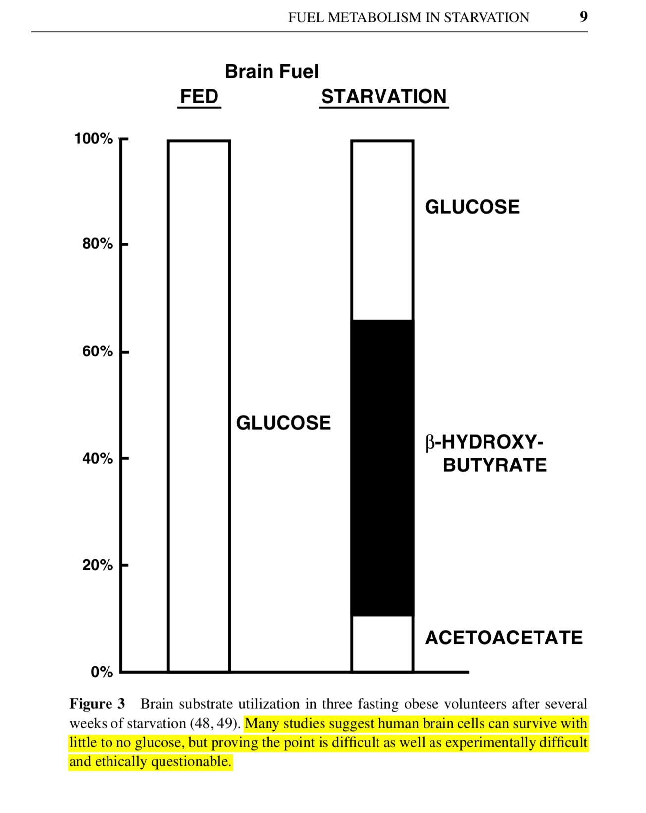 Brain substrate utilization in three fasting obese volunteers after several weeks of starvation switches from 100% Glucose to 70% Ketones.