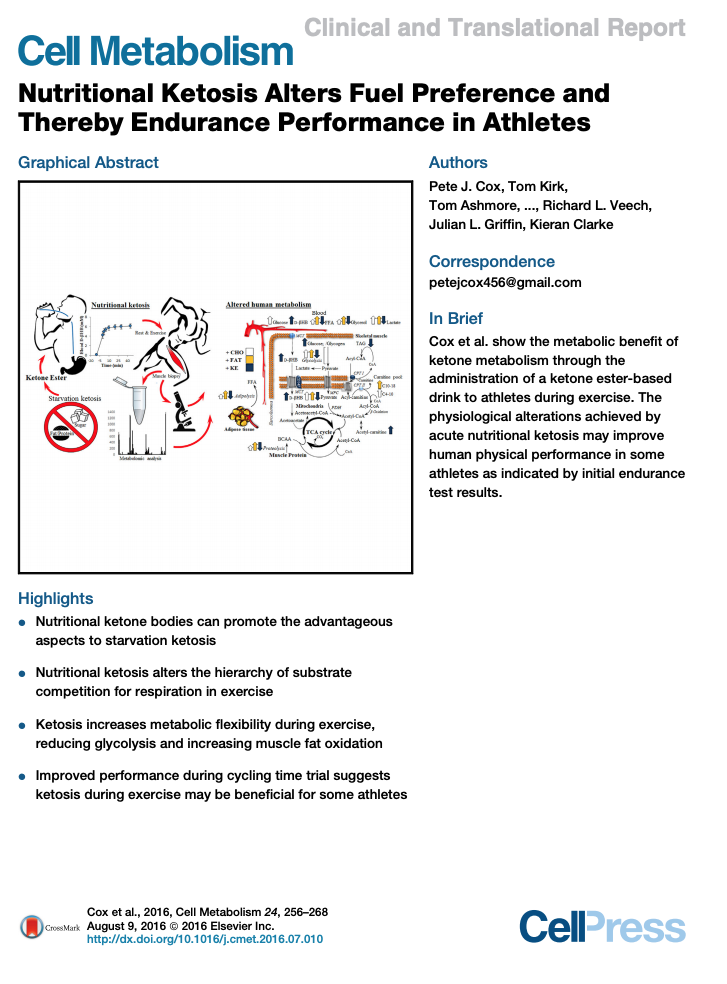 "We have demonstrated the metabolic effects of elevated circulating ketone bodies as a fuel and biological signal to create a unique physiological condition. Ketosis may alter substrate competition for respiration, while improving oxidative energy transduction under certain conditions, such as endurance exer-cise. Consequently, nutritional ketosis may help to unlock greater human metabolic potential."