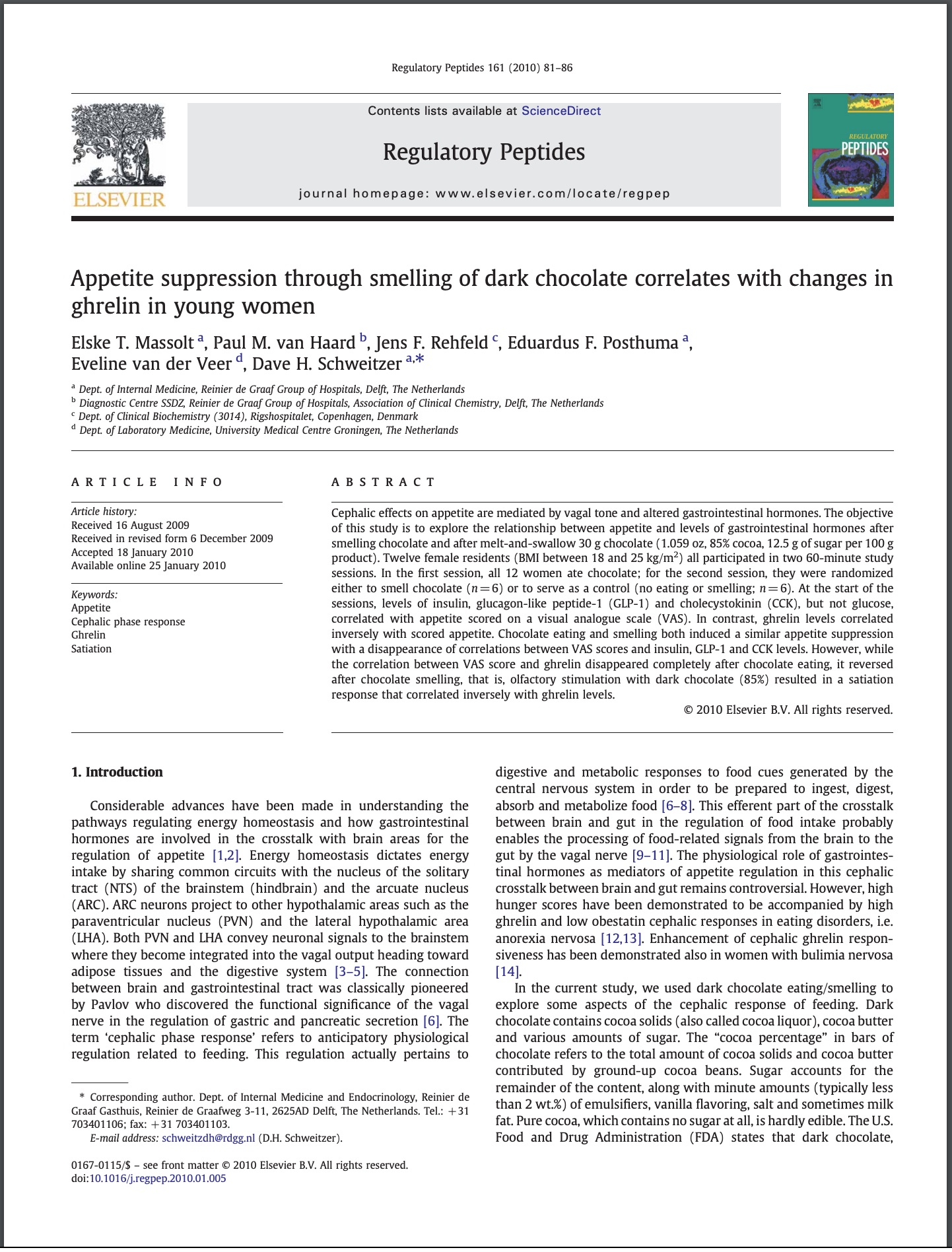 The objective of this study is to explore the relationship between appetite and levels of gastrointestinal hormones after smelling chocolate and after melt-and-swallow 30 g chocolate (1.059 oz, 85% cocoa, 12.5 g of sugar per 100 g product).