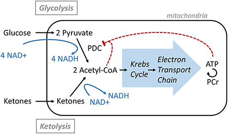 "The NAD+ requirement of the glycolytic and ketolytic pathways is illustrated in Figure 3. Glycolysis requires 4 NAD+ to make 2 Acetyl-CoA, while ketolysis consumes no NAD+ to make Acetyl-CoA from AcA, and only one NAD+ to convert BHB to AcA (6). This is to the best of our knowledge the first interventional study that shows that ketones can have a NAD+ sparing effect in healthy human brain."